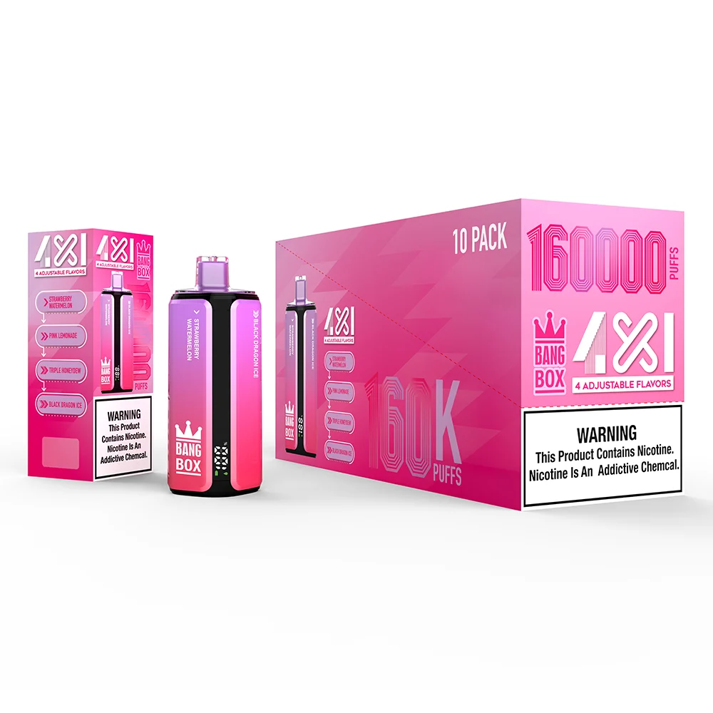 Il Bang BOX puff 160K tiri è un innovativo vape usa e getta multi-gusto 4-in-1, con una massa capacità di liquido di 80ml e bobine quad-mesh, progettato specificamente per eliminare la stanchezza del gusto per gli utenti di alto volume.