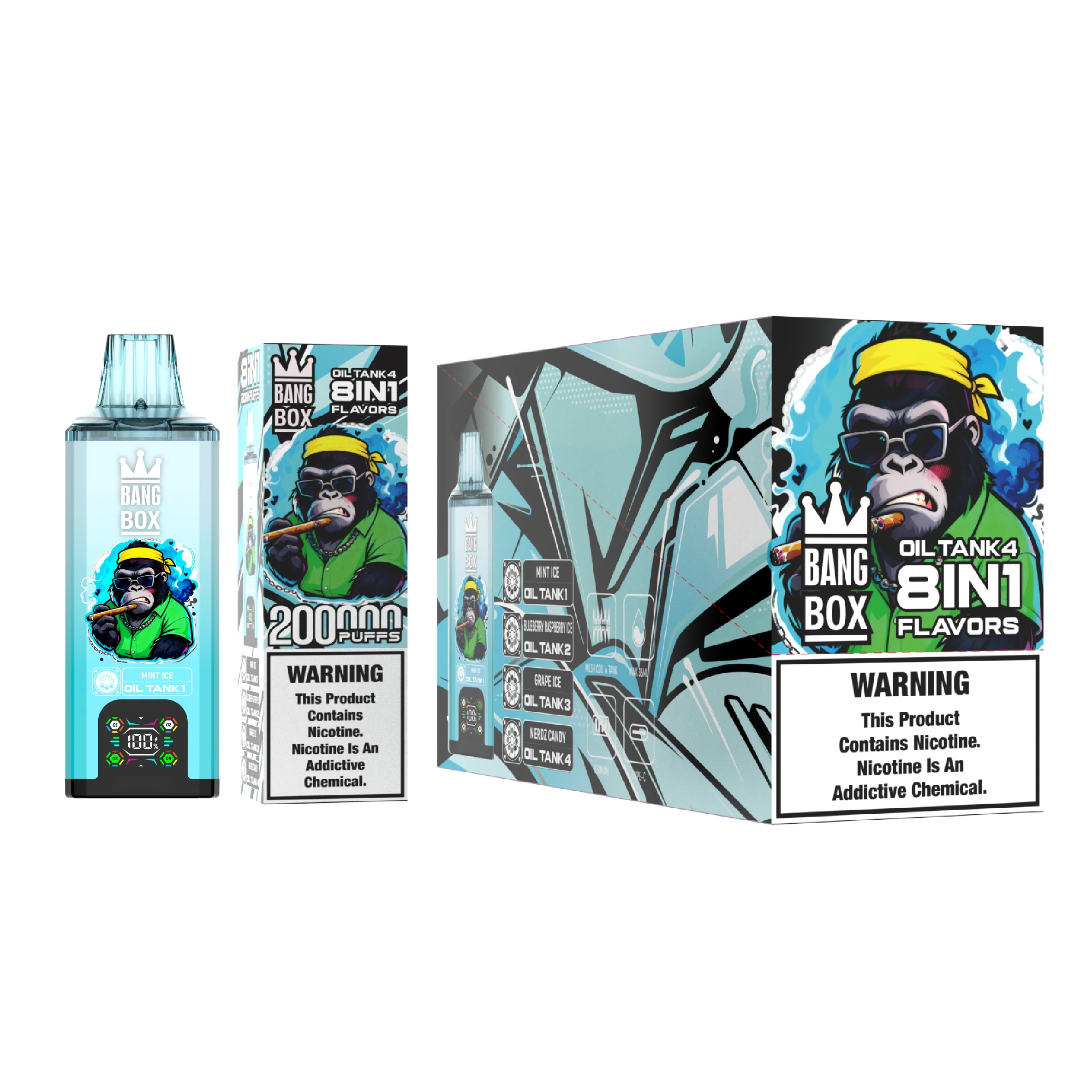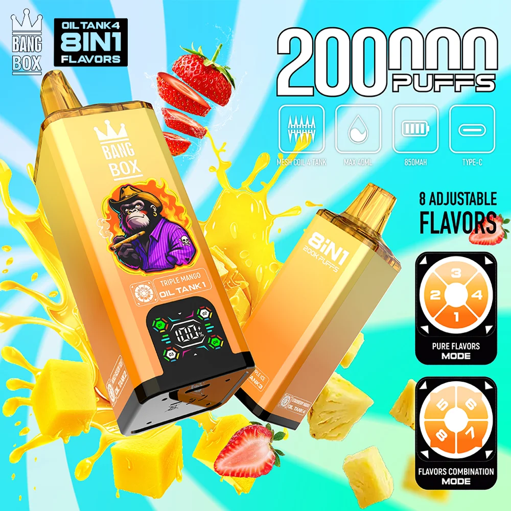 Il Bang BOX Puffs 200000 tiri è il dispositivo usa e getta ad alta capacità 8-in-1 definitivo nel settore, caratterizzato da un enorme serbatoio di e-liquid da 100ml e un sistema a bobina quad-mesh in dual mode per una versatilità di sapore e una longevità senza precedenti.