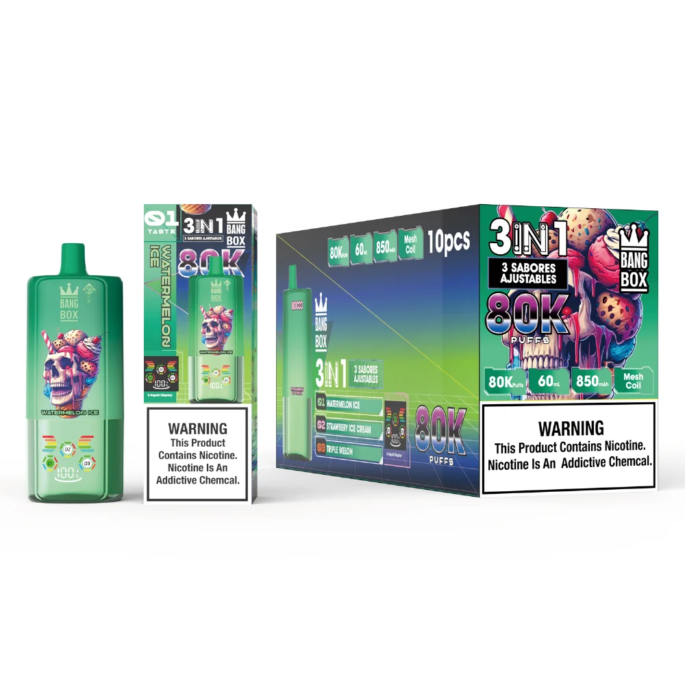 Bang Box 80000 Puffs è un vape monouso ad alta capacità con un interruttore di gusto rotante 3-in-1. Ha una capacità di e-liquido di 60ml, spirali a triplo mesh e una batteria da 850mAh. Il dispositivo include un cool design a forma di teschio e una finestra intelligente per monitorare i livelli di batteria e di liquido.