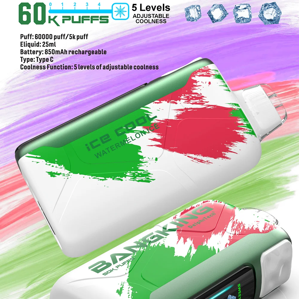 Bang King 60K Vape Ice Cool è una novità per i vapers che sono esigenti sulla loro sensazione di raffreddamento. La maggior parte dei vape ha un livello di “ghiaccio” fisso, ma questo dispositivo presenta 5 livelli di freschezza regolabili. Che tu voglia una leggera brezza rinfrescante o un colpo sub-zero che provoca mal di testa, puoi personalizzarlo secondo le tue preferenze.