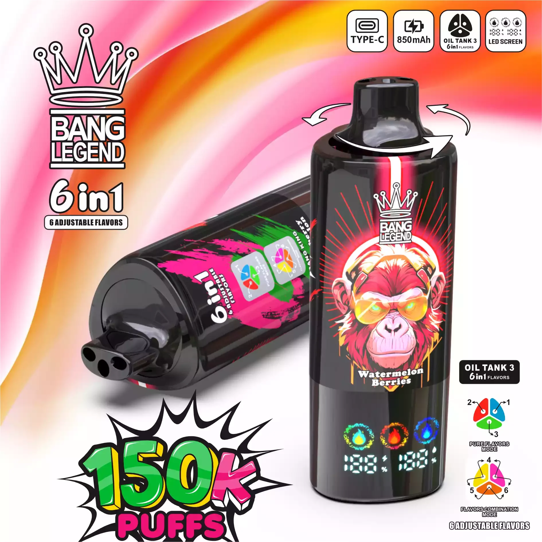 Bang Legend Puff 150000 Tiri Vape Ha un design unico di sapore 6 in 1. Il dispositivo include uno schermo intelligente in basso. Questa schermata mostra il livello del liquido elettronico, il numero di sbuffi e il livello attuale della batteria. Il design è nero e ha un logo di testa di scimmia.