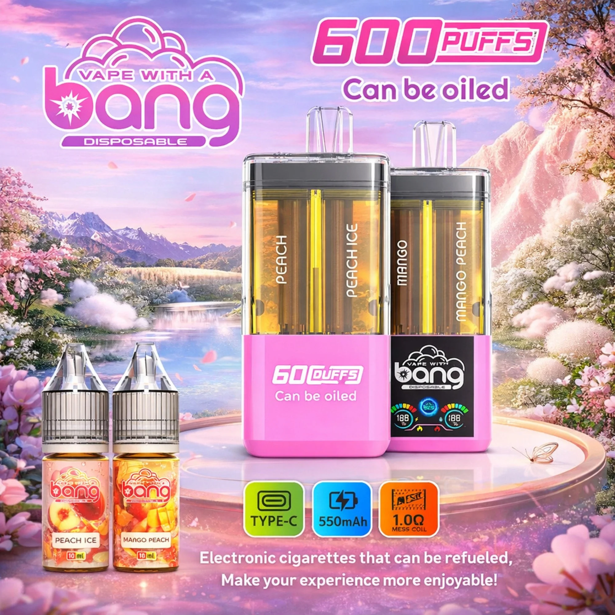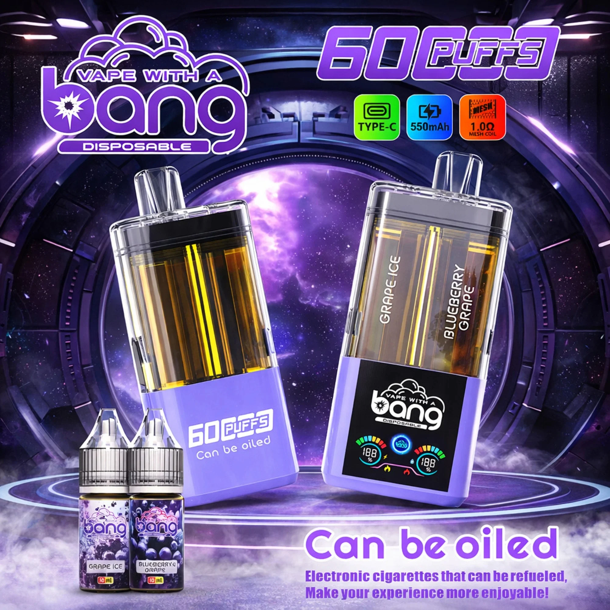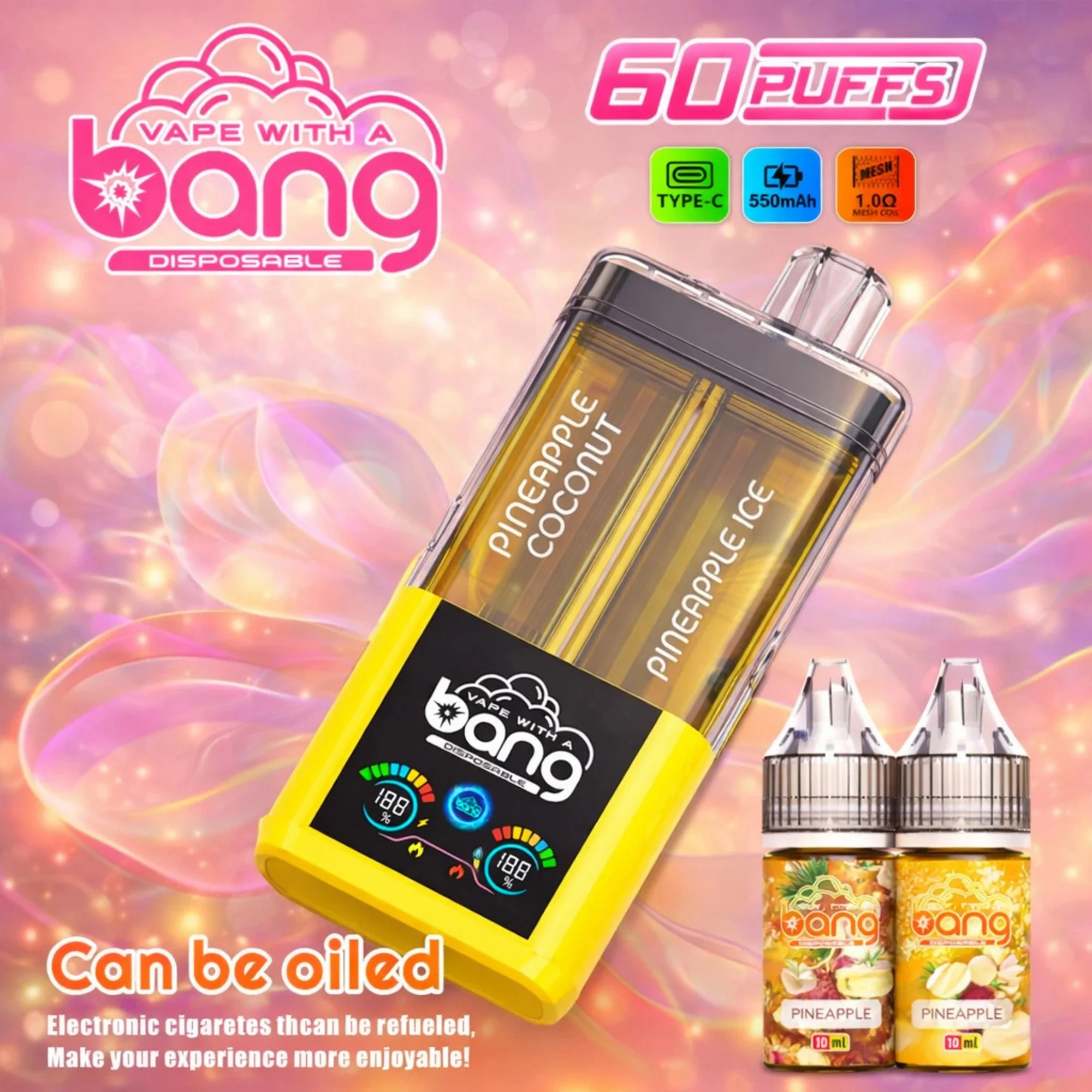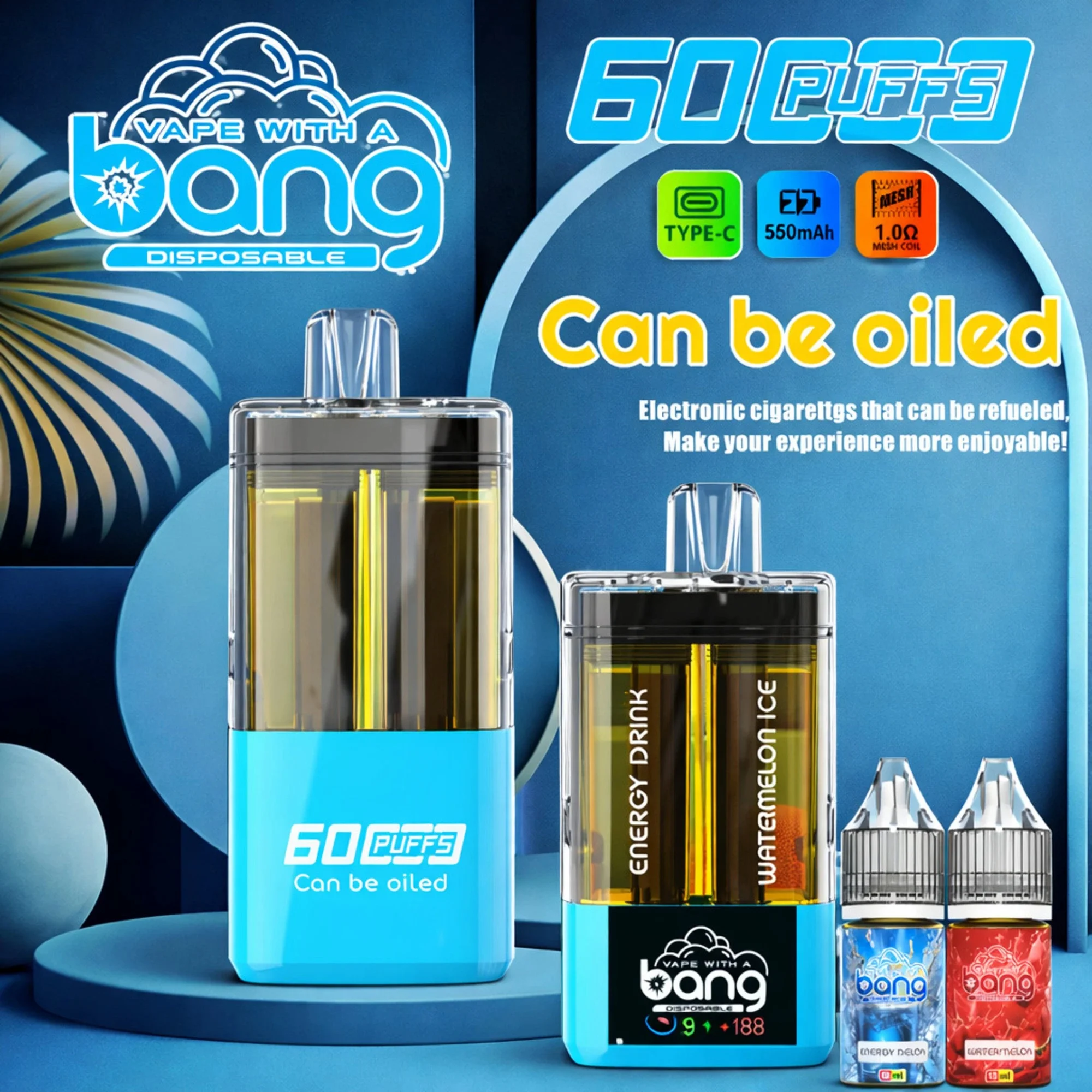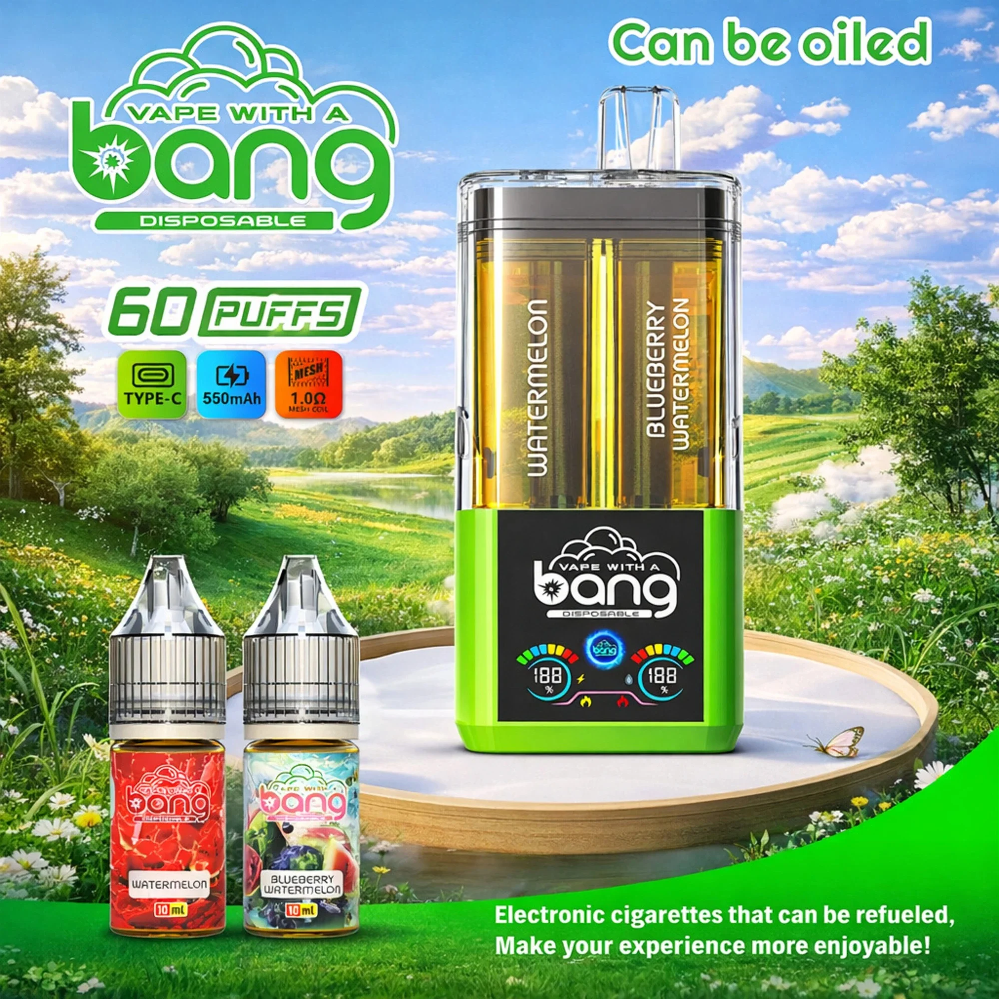 La sigaretta elettronica usa e getta 4 in 1 Bang Blaze Bang Blaze 60K Puff 60000 Tiri e quattro gusti unici. Dotato di un livello di batteria intelligente e display di conteggio delle sbuffi, una batteria ricaricabile di tipo C da 650 mAh e quattro bobine a rete, ITS ideale per il commercio all’ingrosso e al dettaglio.